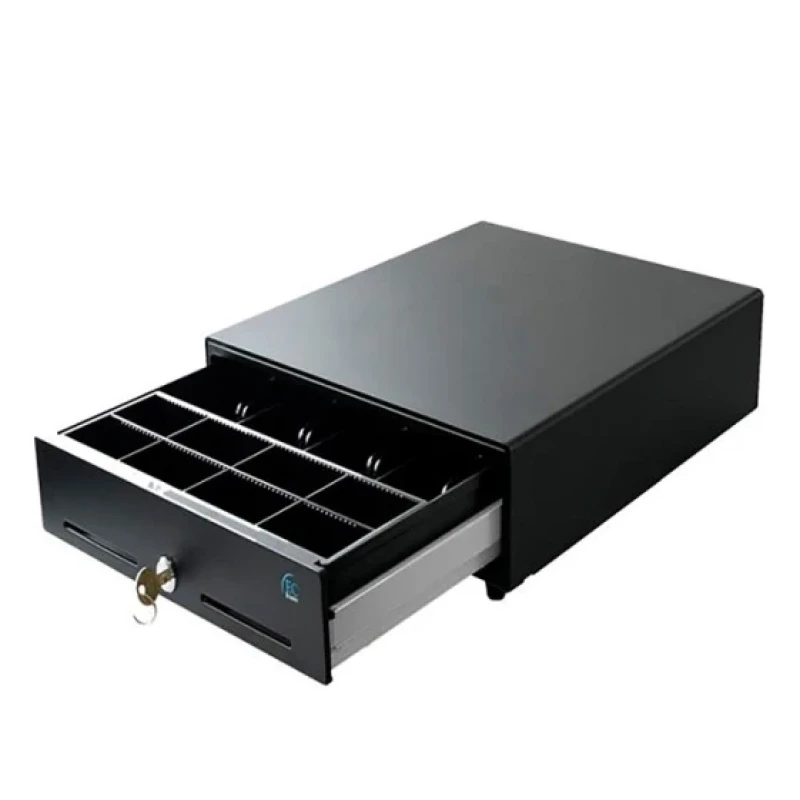 Construcción de acero. Frente de Acero inoxidable pintado. 4 billetes / 8 monedas. Charola de dinero: Sujetadores de billetes Metálico. llave con 3 posiciones. Acceso frontal para documentos. Compatibilidad: Apertura con todas las marcas de impresoras de recibos. Abierto por señal al solenoide. Interfaz: 12v, 24v para RJ11, para Impresora de recibos. Color: Negro. Garantía limitada. Dimensiones de embalaje: 13,8" x 15,9" x 3,5". Peso de embalaje: 4,3kg.